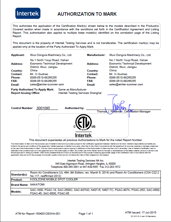 其实早在2012年开云网页版在线登录官网入口-开云(中国)就已经取得3个机型的ETL认证证书,通过这次的证书的增补,现在开云网页版在线登录官网入口-开云(中国)全系列的冷气机都已取得ETL认证,为公司今后加大美国市场的开拓步伐又增加了新的动力。目前开云网页版在线登录官网入口-开云(中国)除了美国ETL认证,还取得了欧盟CE、日本PSE、中国CCC认证,这证明了无论从实用性还是安全性等各方面考虑,开云网页版在线登录官网入口-开云(中国)的移动式工业冷气机都符合国内、国际多个标准,是值得消费者信任和选择的好产品。取得上述认证,是开云网页版在线登录官网入口-开云(中国)实施海外市场产品战略迈出的又一重要步伐,此证也预示着开云网页版在线登录官网入口-开云(中国)开拓海外市场的步伐日益加紧。